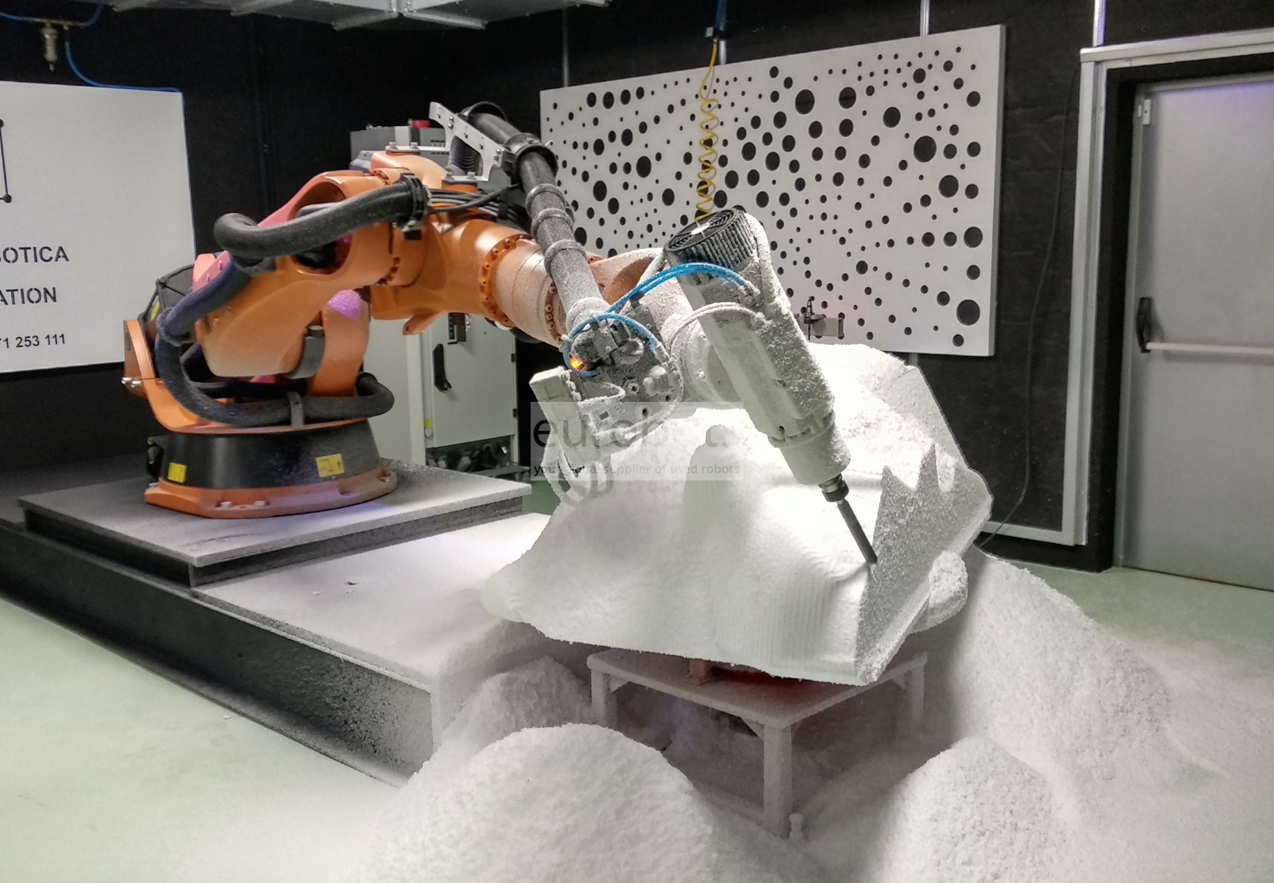 El fresado robótico es el proceso de cortar material a partir de un molde para esculpir una forma específica o compleja utilizando cualquier material, desde plástico, metal, espuma, madera hasta aleaciones. Los robots de fresado pueden realizar los cortes exactos y los movimientos precisos necesarios para producir piezas de máxima calidad. Generalmente este proceso se basa en dos etapas donde la primera consiste en la forma rápida y rentable de eliminar el material dando paso a la segunda etapa que es el acabado de la estructura basado en dimensiones, grado de superficies que determinan surcos en detalle, perfiles, aberturas e incluso contornos de superficies tridimensionales.